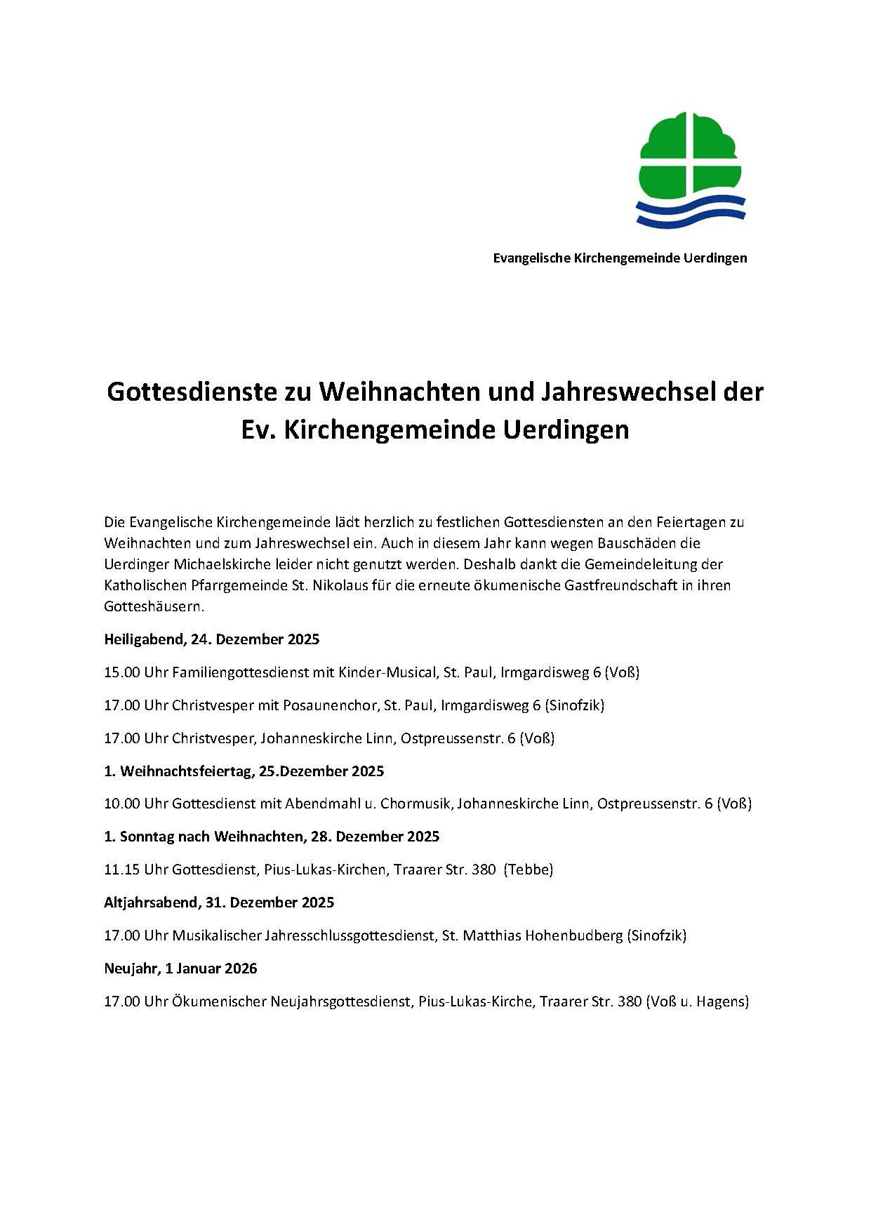 Das Gemeindebüro ist in der Zeit vom 17. Dezember bis zum 5. Januar nicht besetzt. In dringenden Fällen wenden Sie sich bitte an unseren Pfarrer Ruben Voß. Sie erreichen Ihn unter der Rufnummer: 0157 – 56 54 14 41